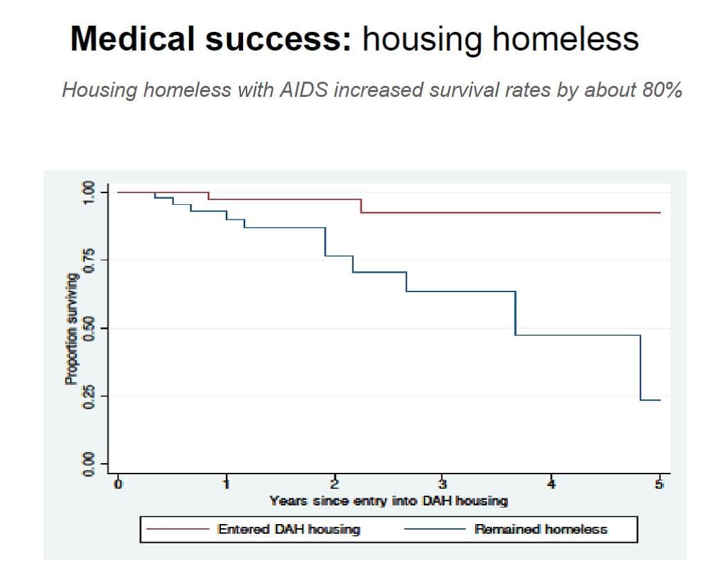 Data from Dr. Bamberger’s work in San Francisco suggests that providing housing to the homeless increased survival rates by 80%. Yes, that is correct, 80%. Moreover, he has found that cost savings per patient per year averaged $20,000 – $30,000.